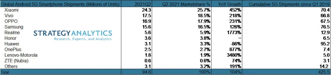 Strategy Analytics:2021 第二季度小米引领全球 5G 安卓智能手机市场