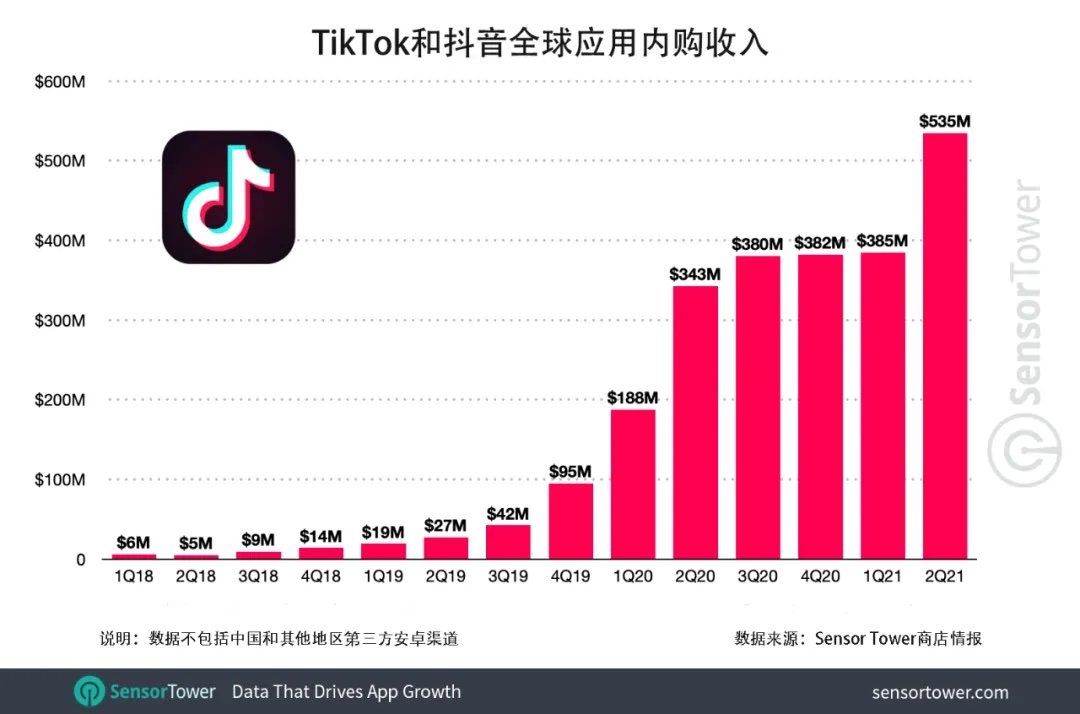 本年第二季度,TikTok和抖音的使用内购收入比第一季度(3.85亿美元)增加了39%,到达5.35亿美元,是2020年Q2以来,环比增加最快的季度。