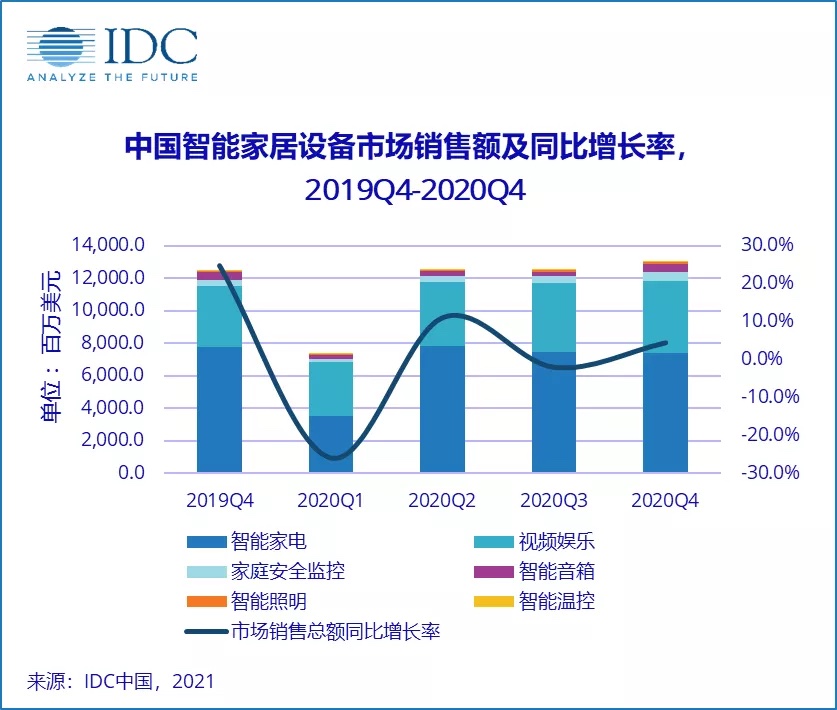 IDC:2020 Q4 中国智能家居市场设备出货量 6087 万台,同比增长 6%