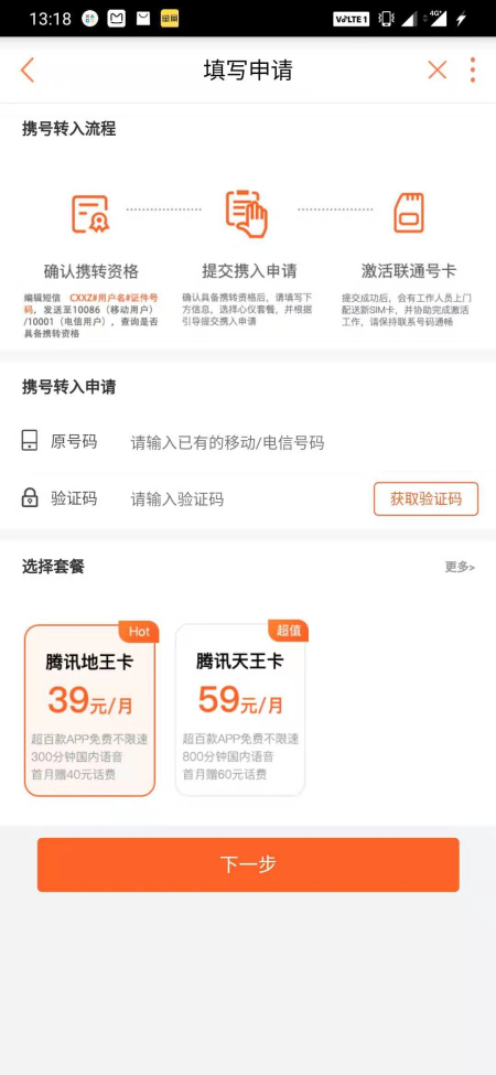 中国联通手机营业厅最近新增了一项名为“异网携入”的功用,部分用户能够直接处理携号转网事务。不过现在只能挑选处理腾讯地王卡和腾讯天王卡套餐,价格分别为 39元/月和 59 元/月。