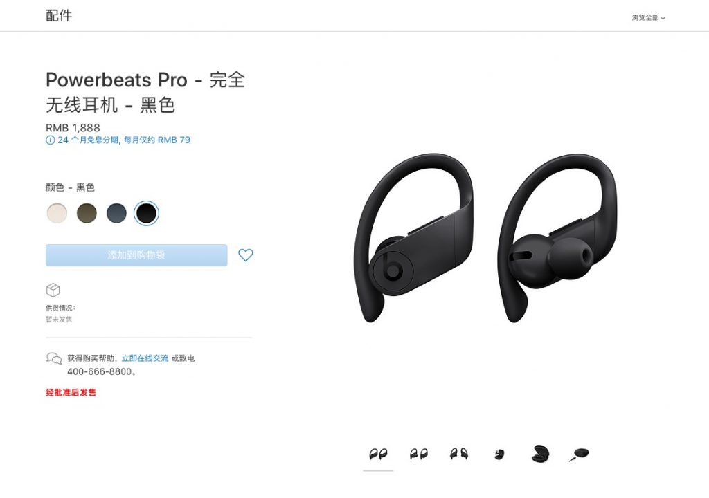 Powerbeats Pro 供给黑色、海军蓝、森林绿、象牙白 4 种颜色可选。这款耳机在我国大陆的价格为 1888 元人民币,不过现在官网显现“经同意后出售”,暂时无法直接经过我国区 Apple Store 购买。