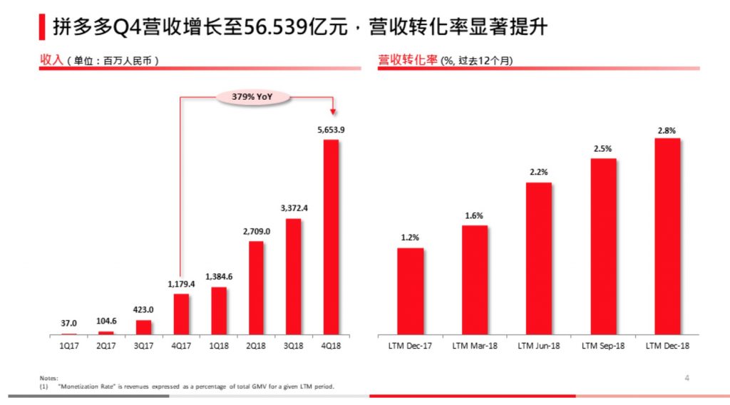 发布了 2018 年第四季度及全年财报。财报显现,拼多多第四季度营收 56.539 亿元人民币,比较 2017 年同期的 11.794 亿元增加了 379%。到 2018 年 12 月 31 日的 12 个月,拼多多 GMV 达 4716 亿元人民币,比较去年同期的 1412 亿元增加 234%。
