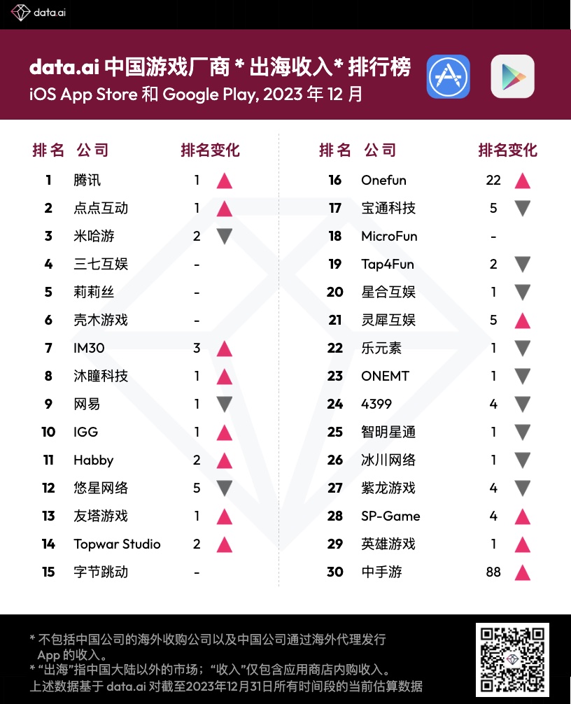 data.ai 发布了 2023 年 12 月我国游戏厂商及使用出海收入 30 强榜单,以下是具体内容: